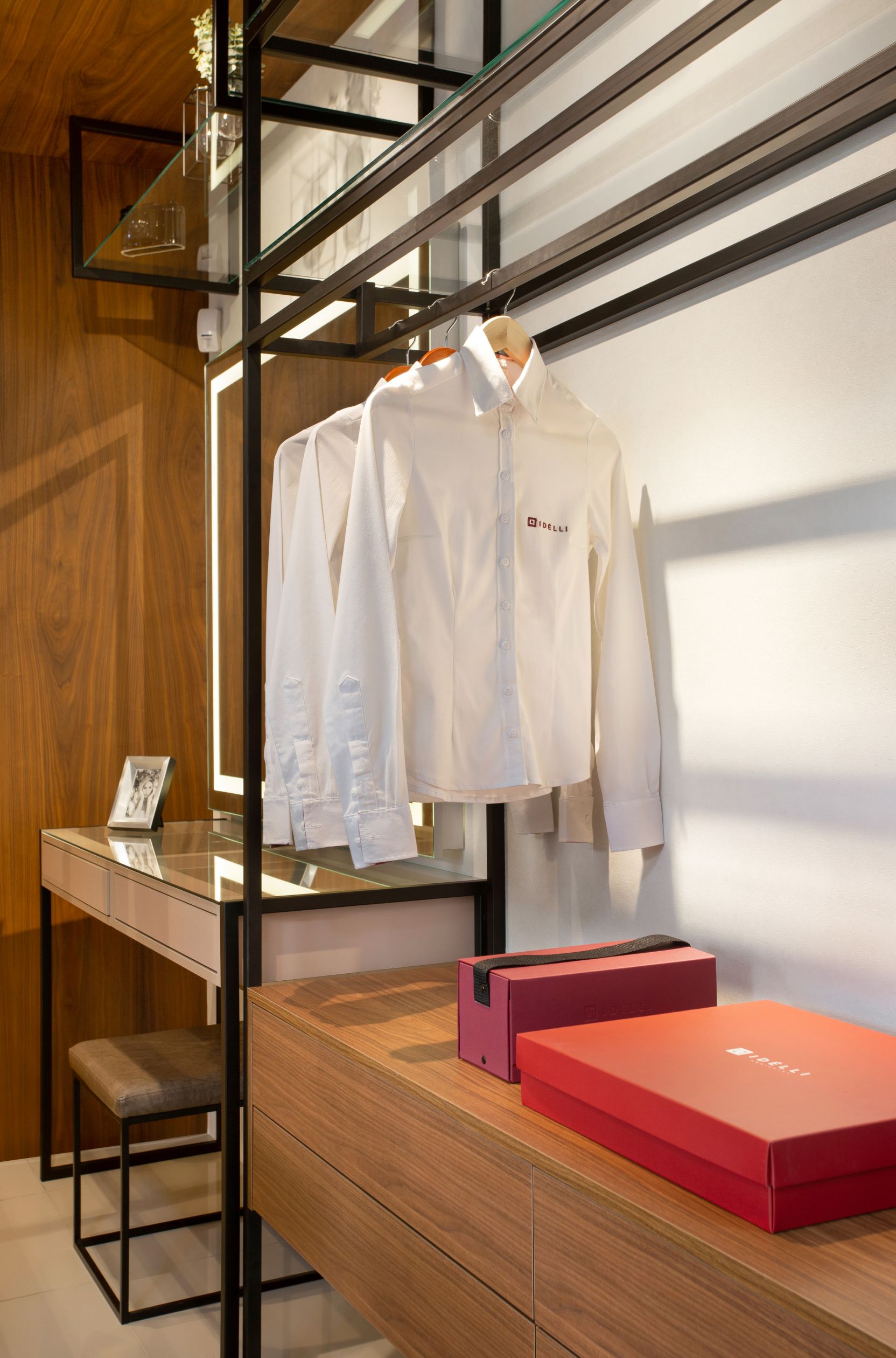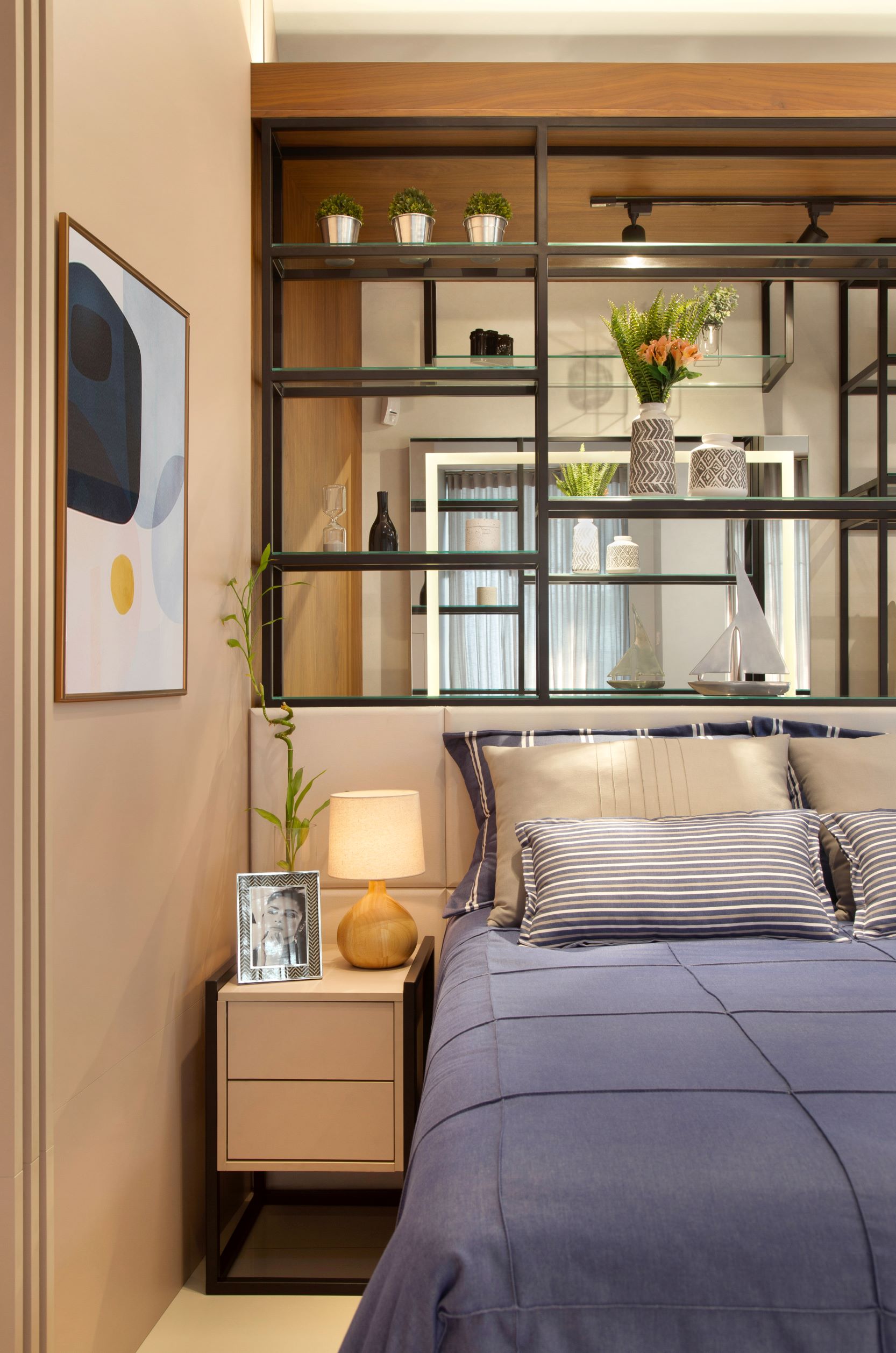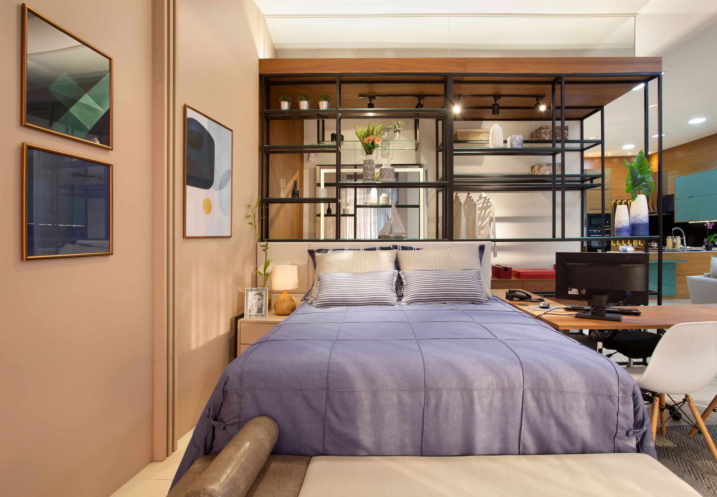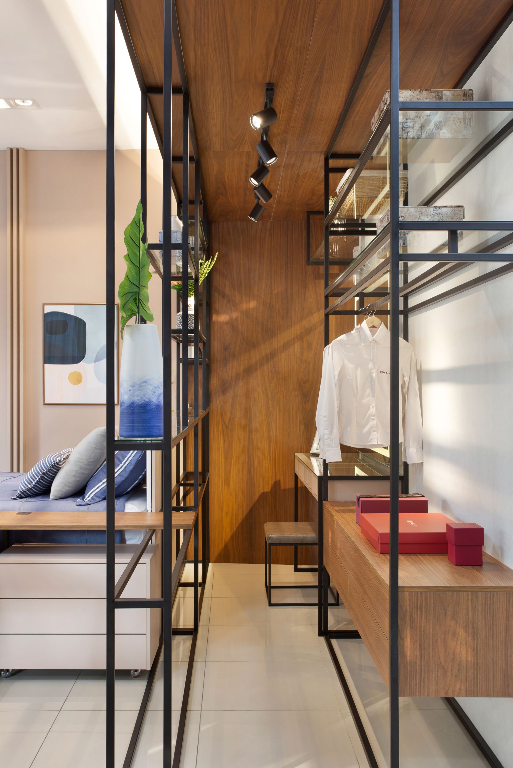 Quarto e closet dividido com estrutura de serralharia projetado pela arquiteta Mariana Bittencourt.