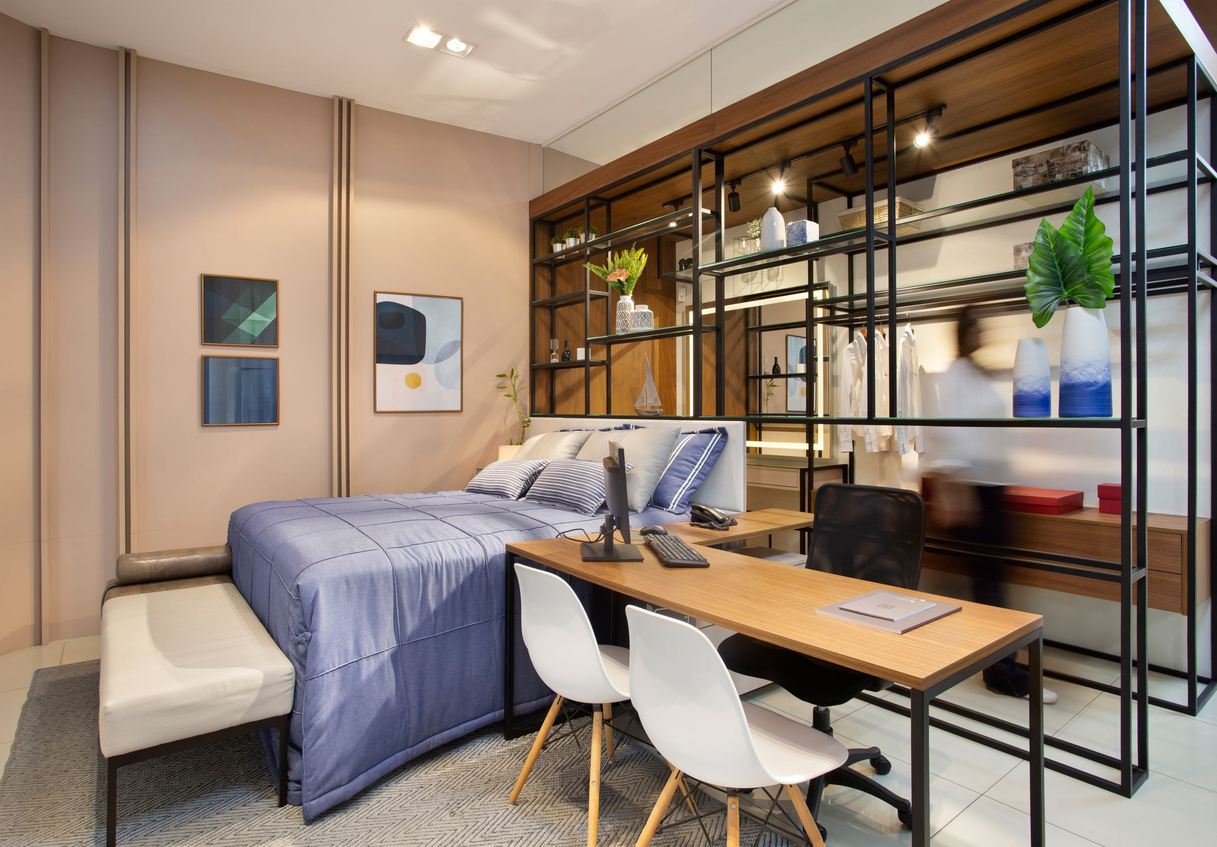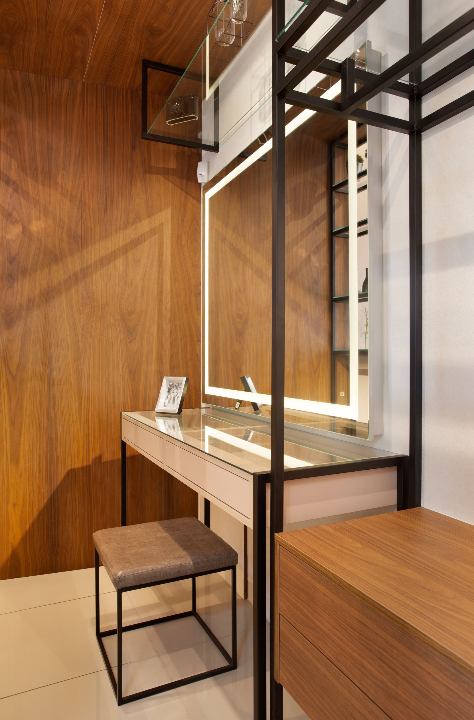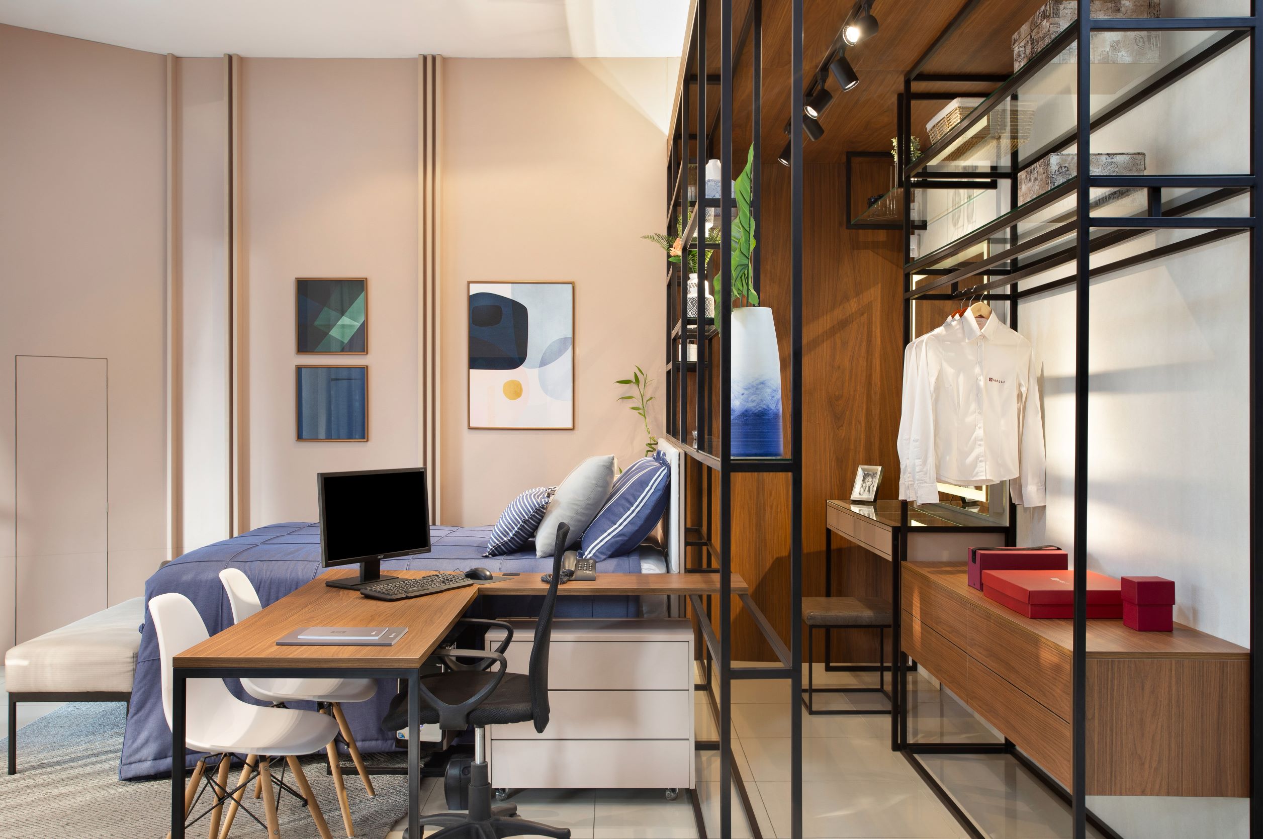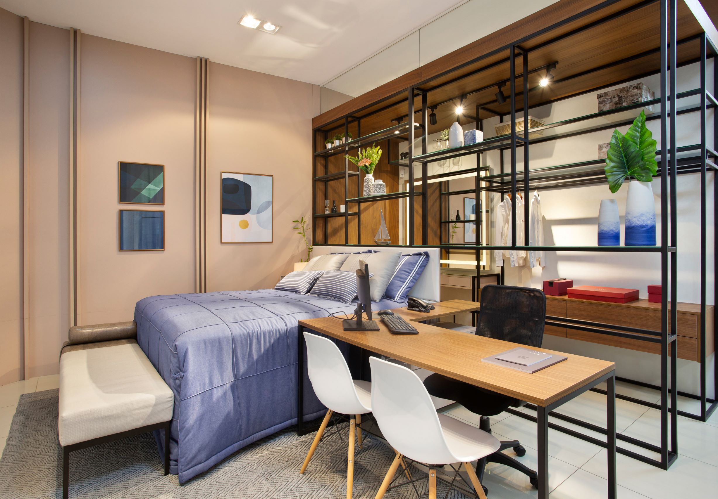 Quarto e closet dividido com estrutura de serralharia projetado pela arquiteta Mariana Bittencourt.