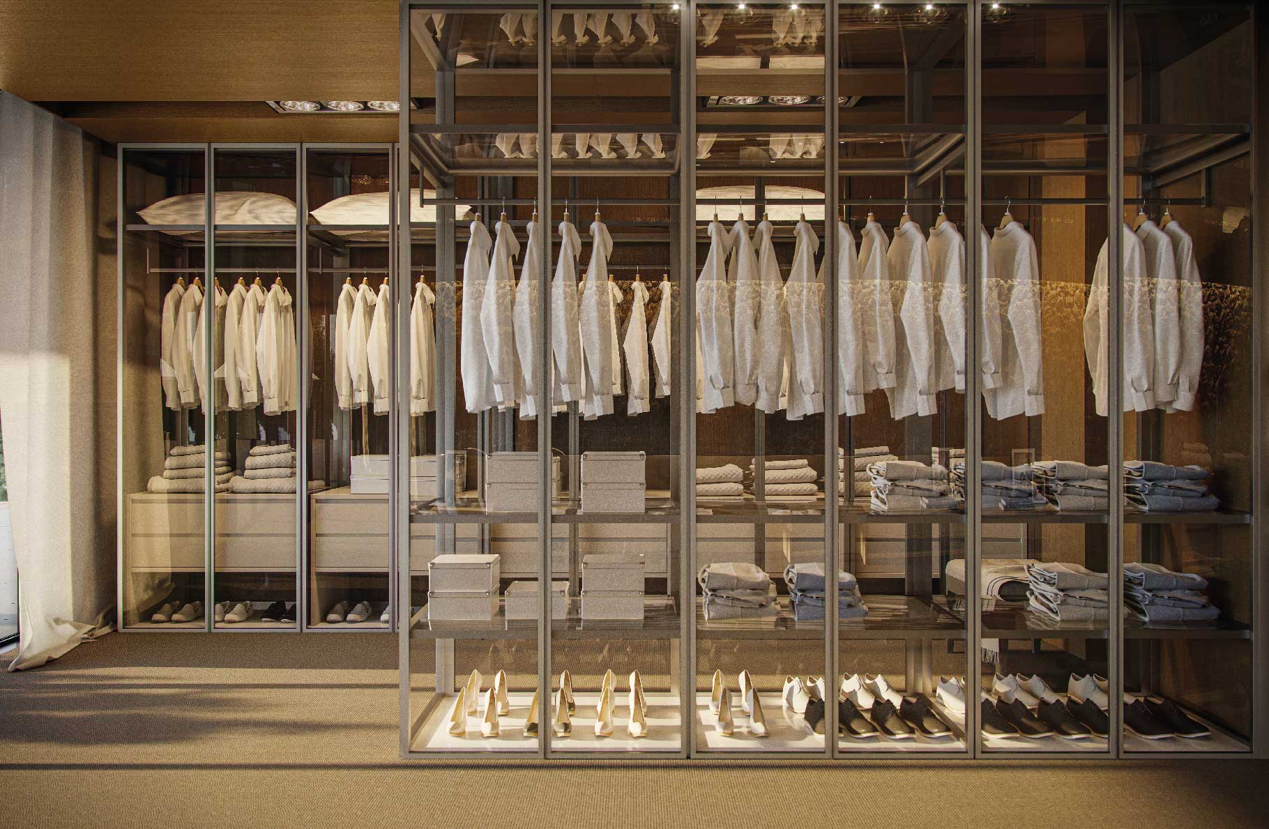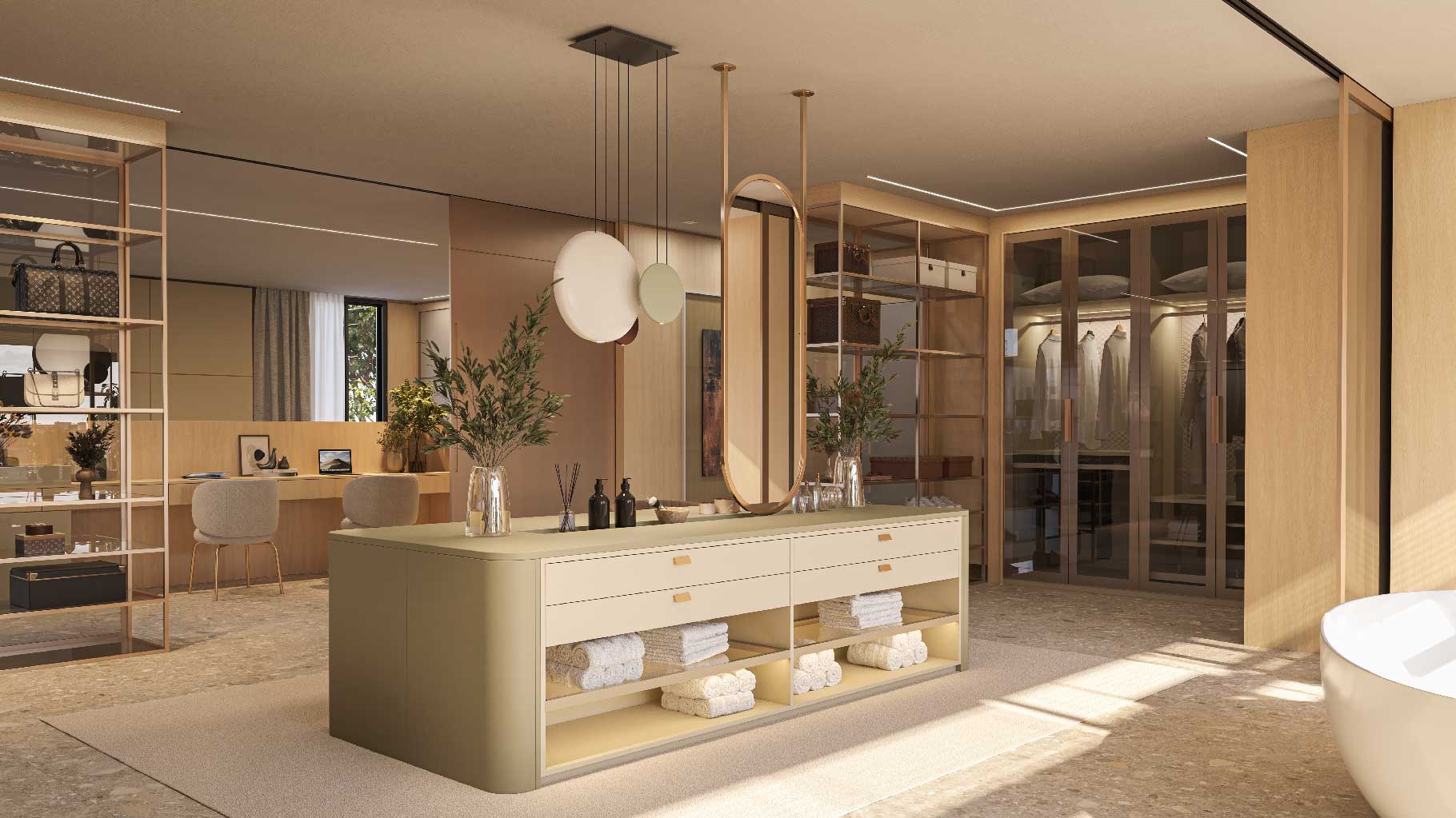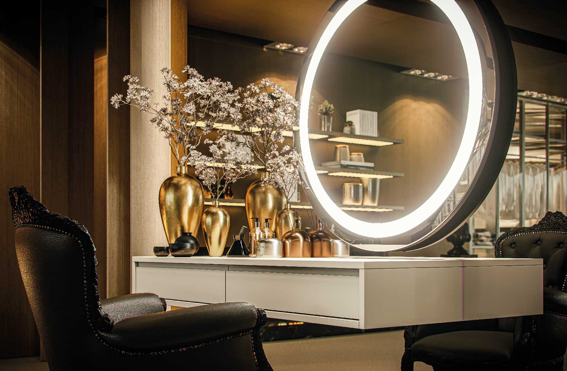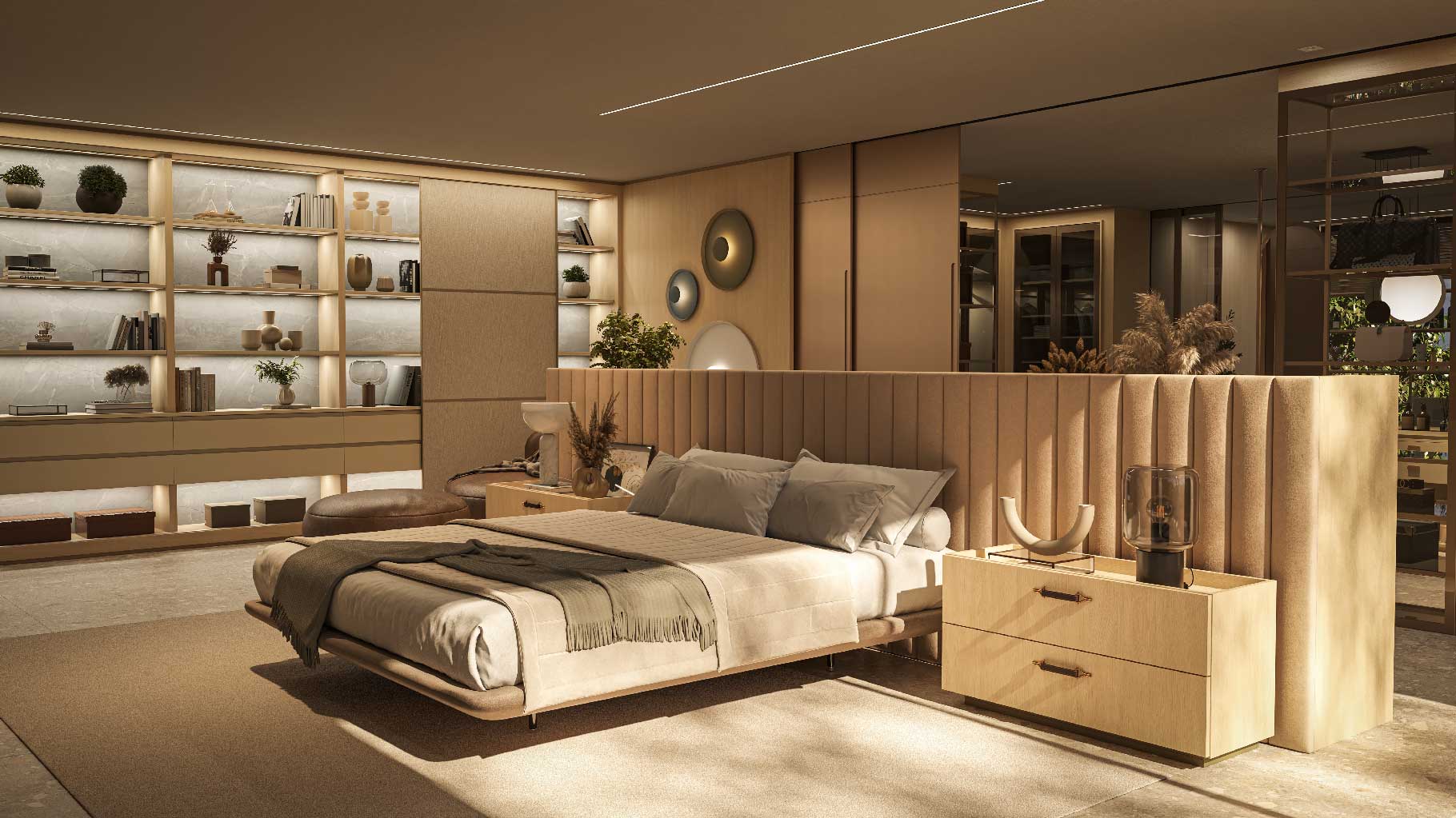 Esses dormitórios contemplam as nuances da coleção, em que o destaque se dá pela Cabina Di Vetro, sua estrutura em alumínio e vidro é feita sob medida e adaptável aos mais diversos espaços, possibilitando ambientes cheios de estilo e personalidade, e também pelo espelho retroiluminado que proporciona muita sofisticação ao ambiente, destacado na quarta imagem.