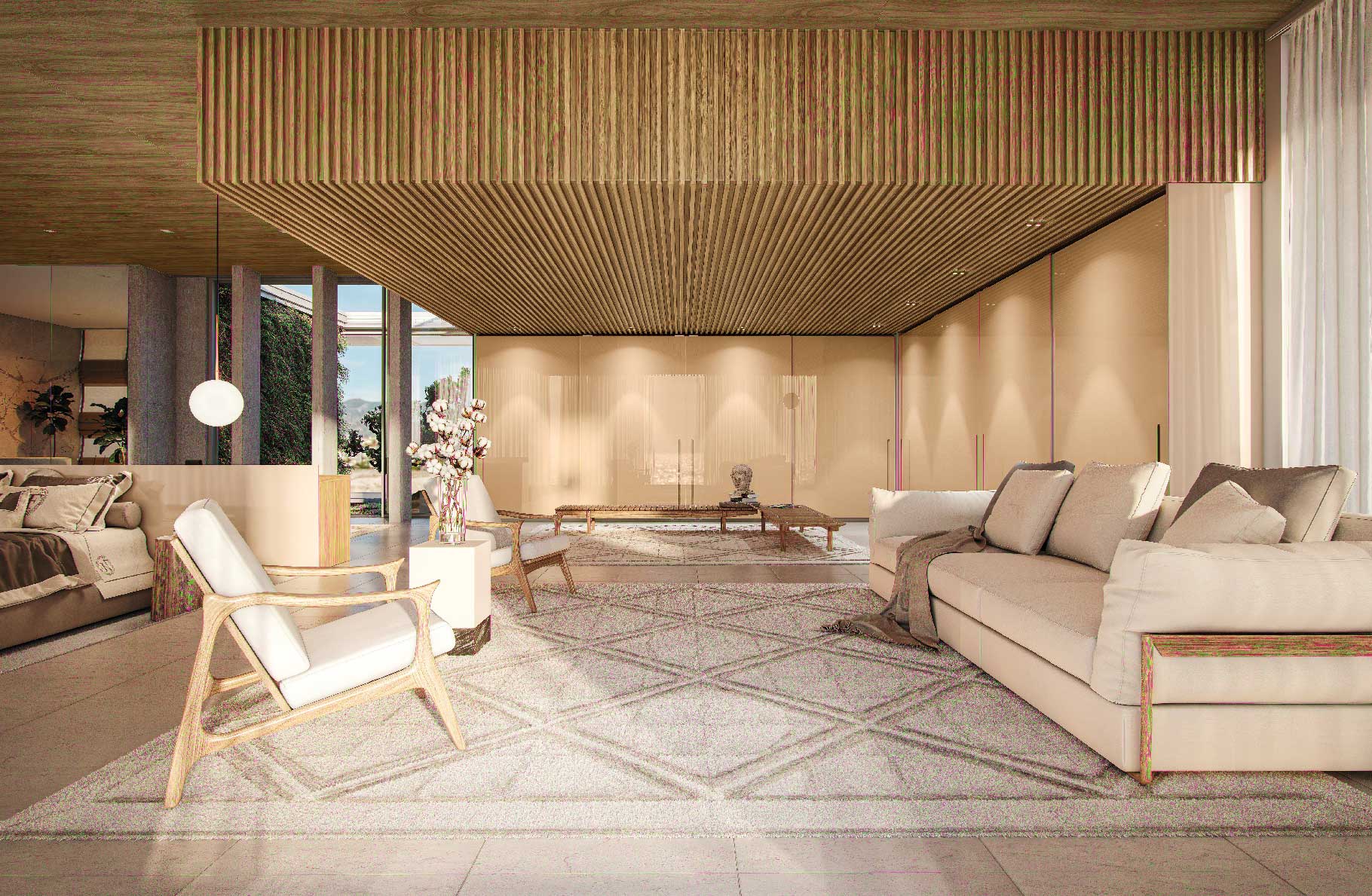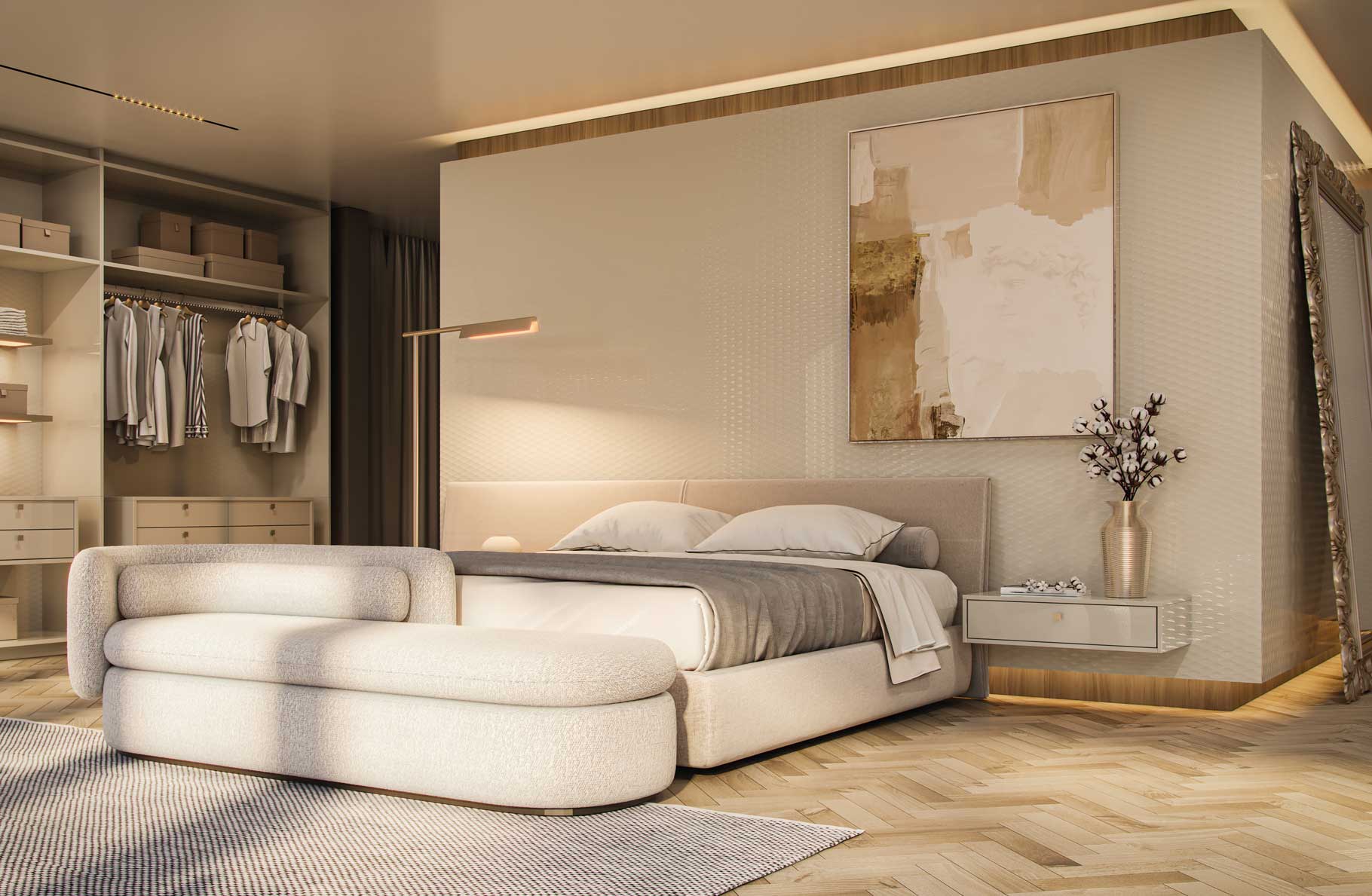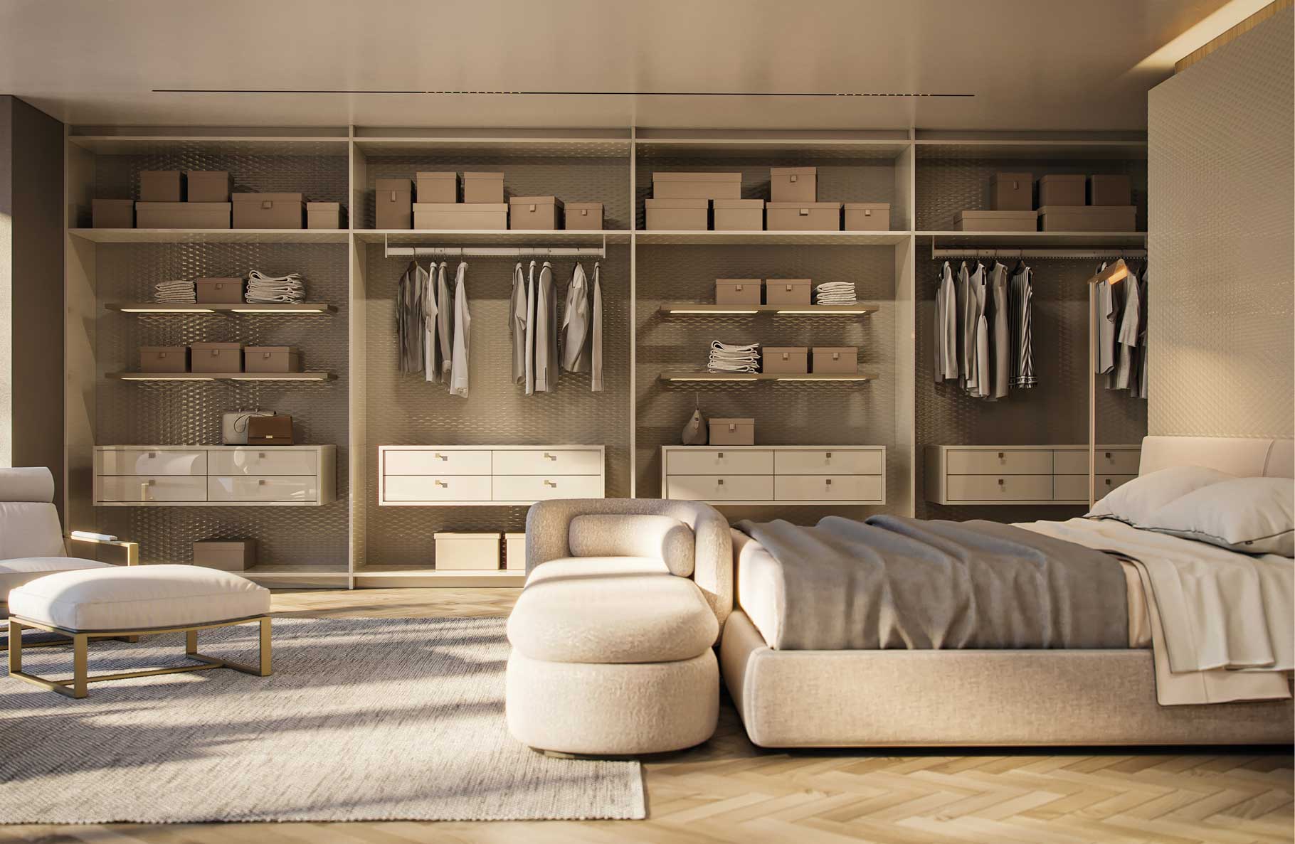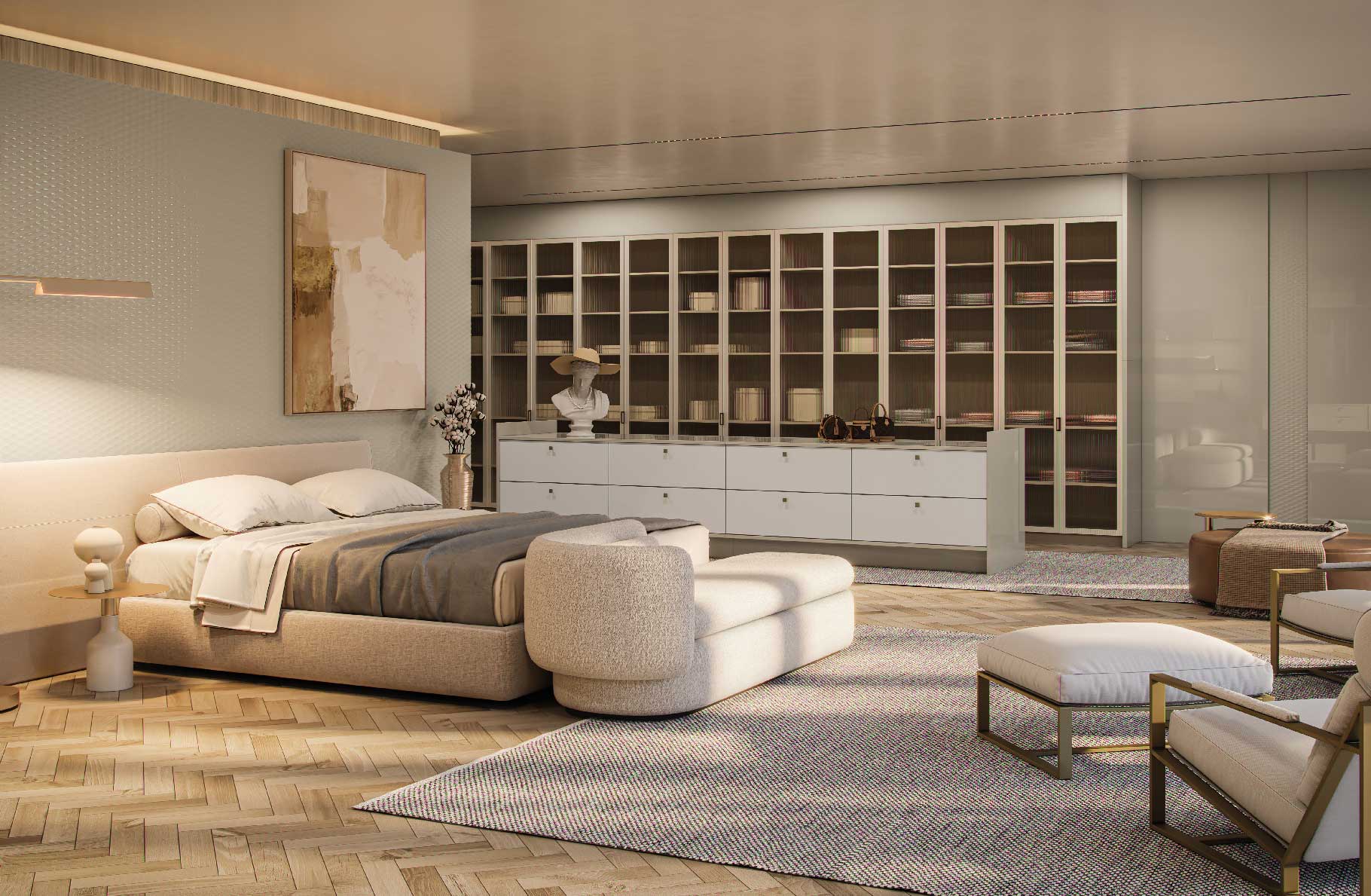 Este dormitório contempla os aspectos desta coleção através do Surface 3D Concha em pintura laqueada aurora, destacado na primeira imagem, da pintura laqueada nude, evidênciada na terceira imagem, e das frentes em Vidro Canelado, tornando cada cantinho personalizado e complementando esta composição.