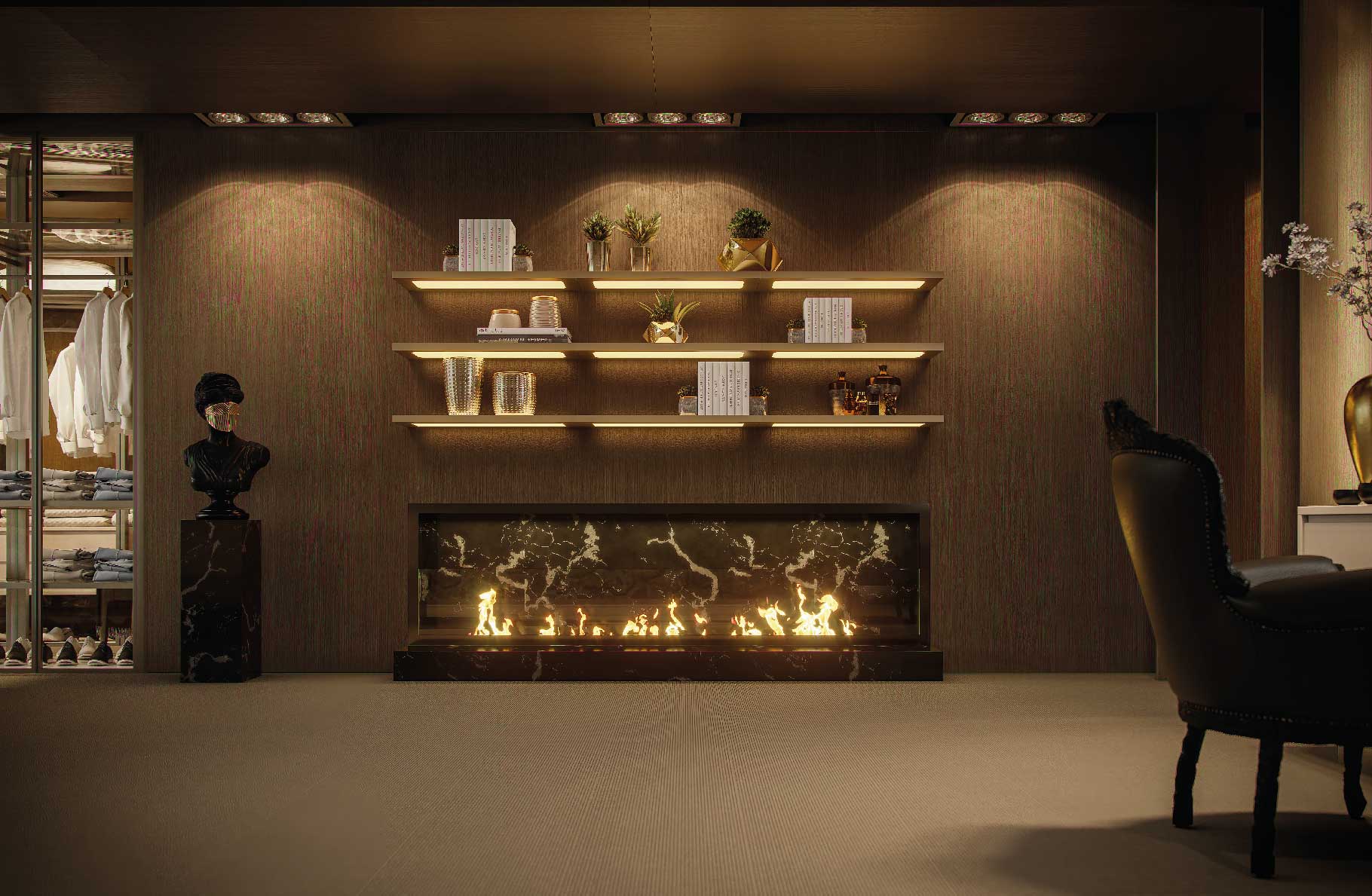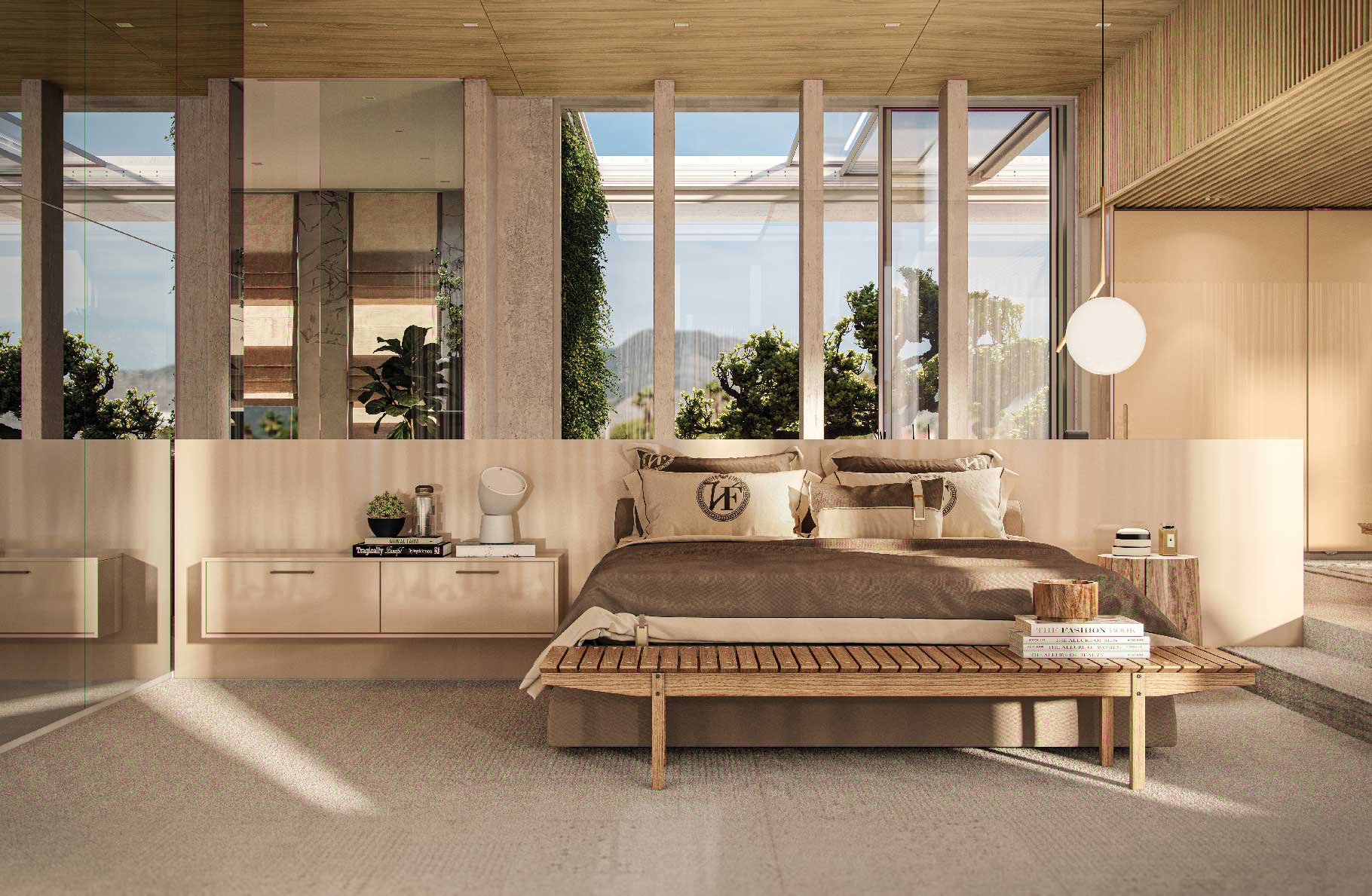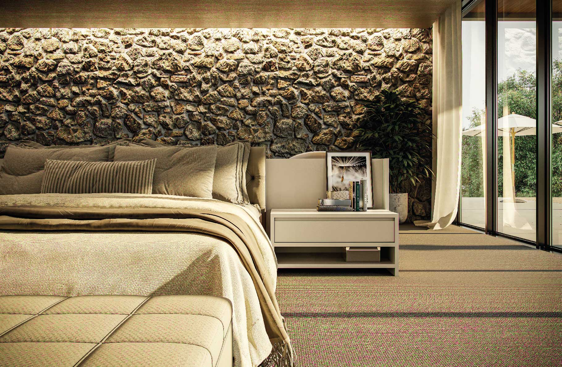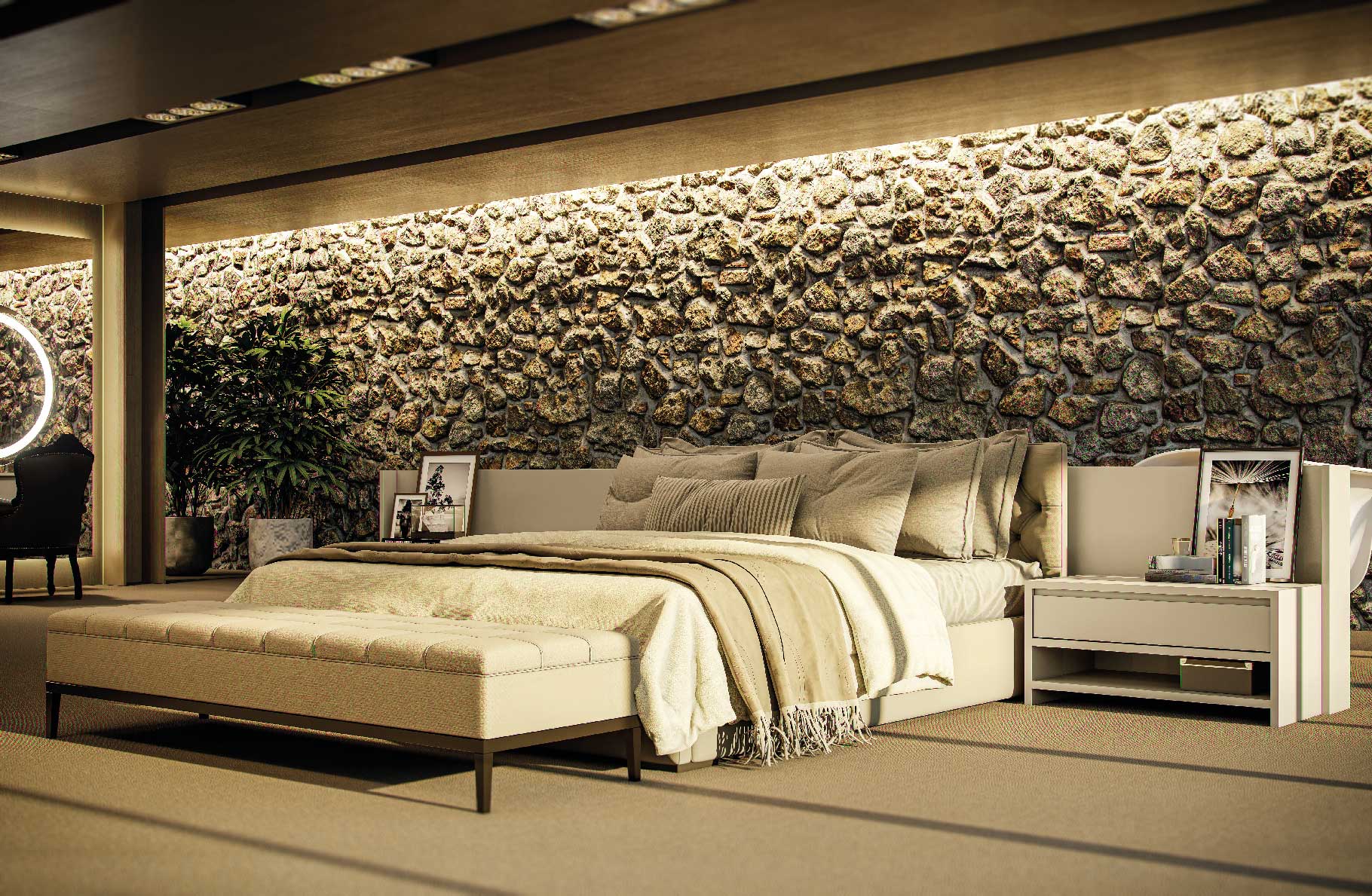 Este dormitório é composto pelas nuances dessa coleção e o destaque fica por conta de alguns elementos imponentes, como a parede revestida de pedra natural e as linhas retas presentes na mesa de cabeceira e nas prateleiras, como mostra a segunda e terceira imagem.