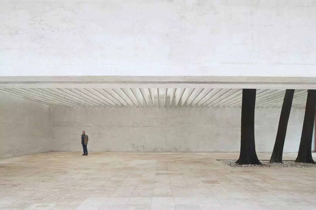 Fehn teve a ideia de não remover as árvores do terreno. Ao preservá-las, permitiu que crescessem livremente dentro da edificação. Com isso, o pavilhão não se impõe sobre o espaço, mas o respeita, convivendo com ele. E essa relação direta com o entorno natural não é o único ponto destaque do projeto.