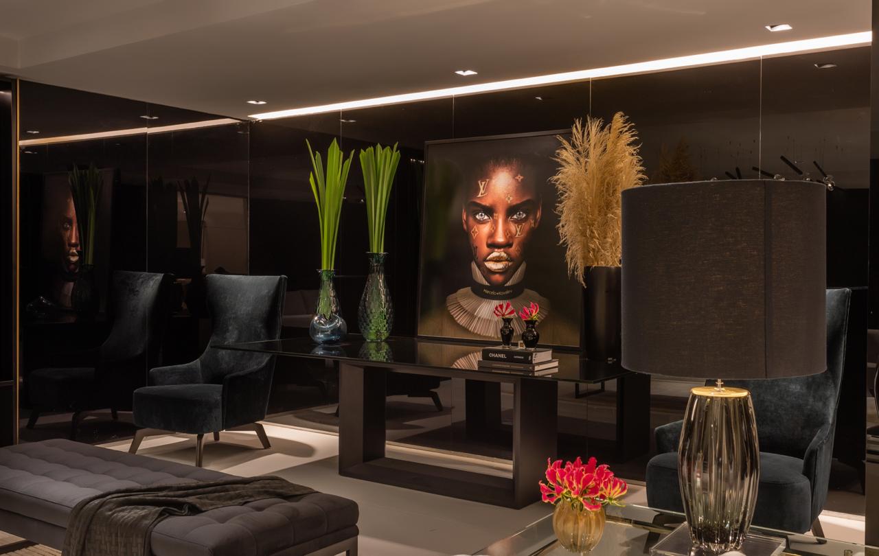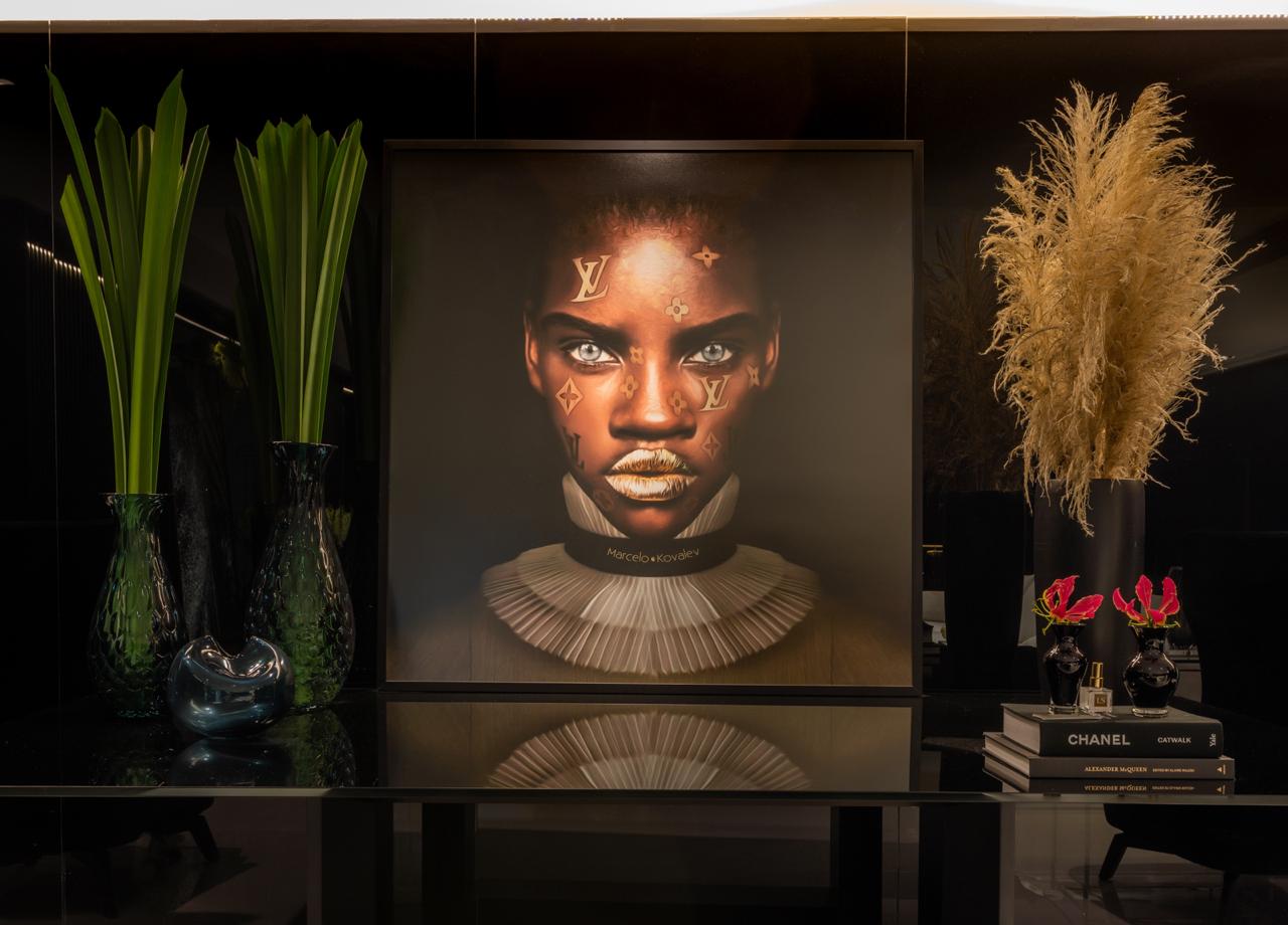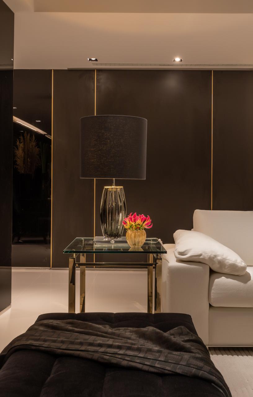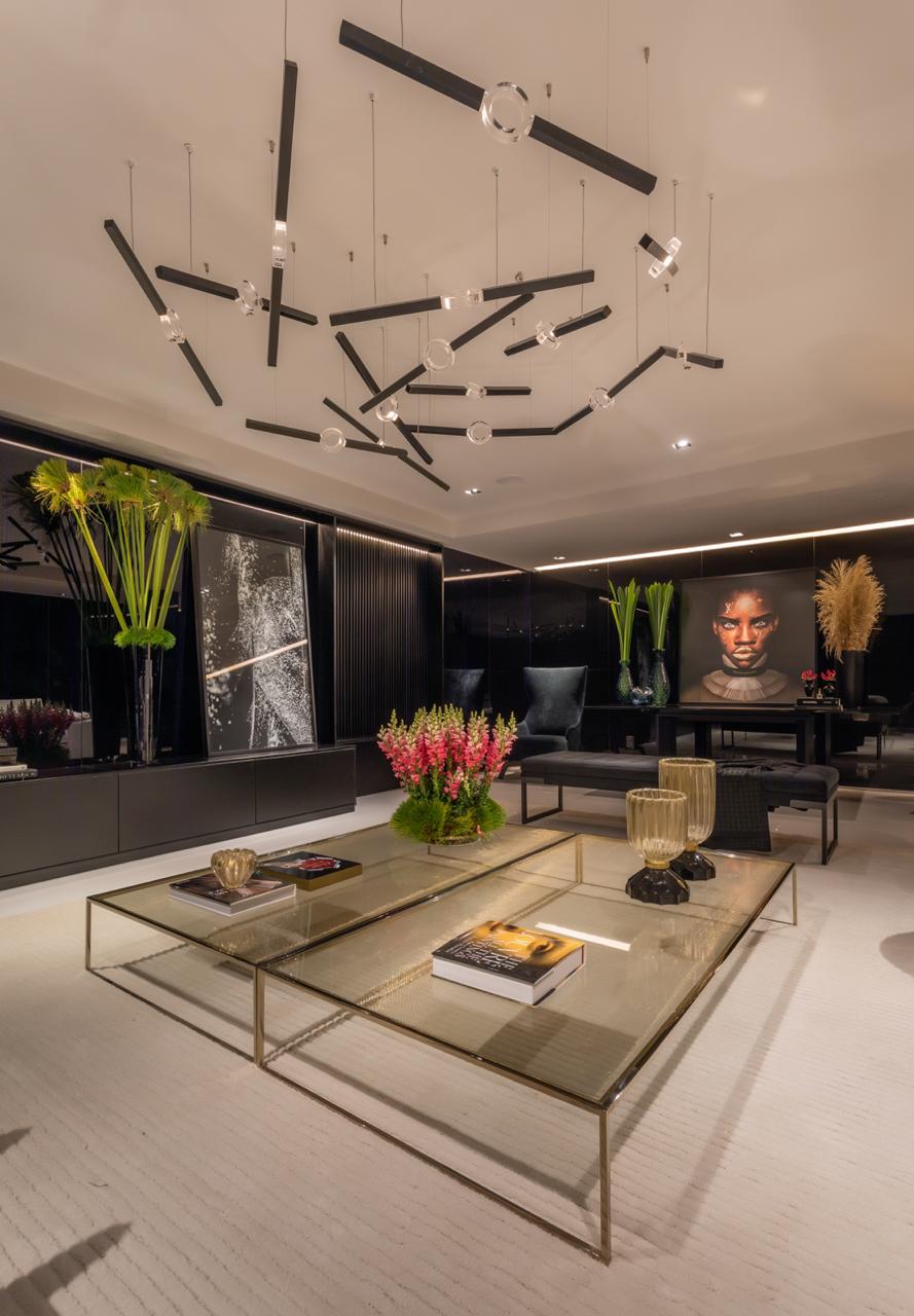 Entre os destaques está o uso das estruturas metálicas em dourado que dá o charme ao ambiente, além da pintura acetinada em preto nas portas Cava para agregar mais nobreza ao projeto. Elementos naturais como trigo também foram acrescentados no projeto.