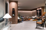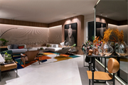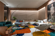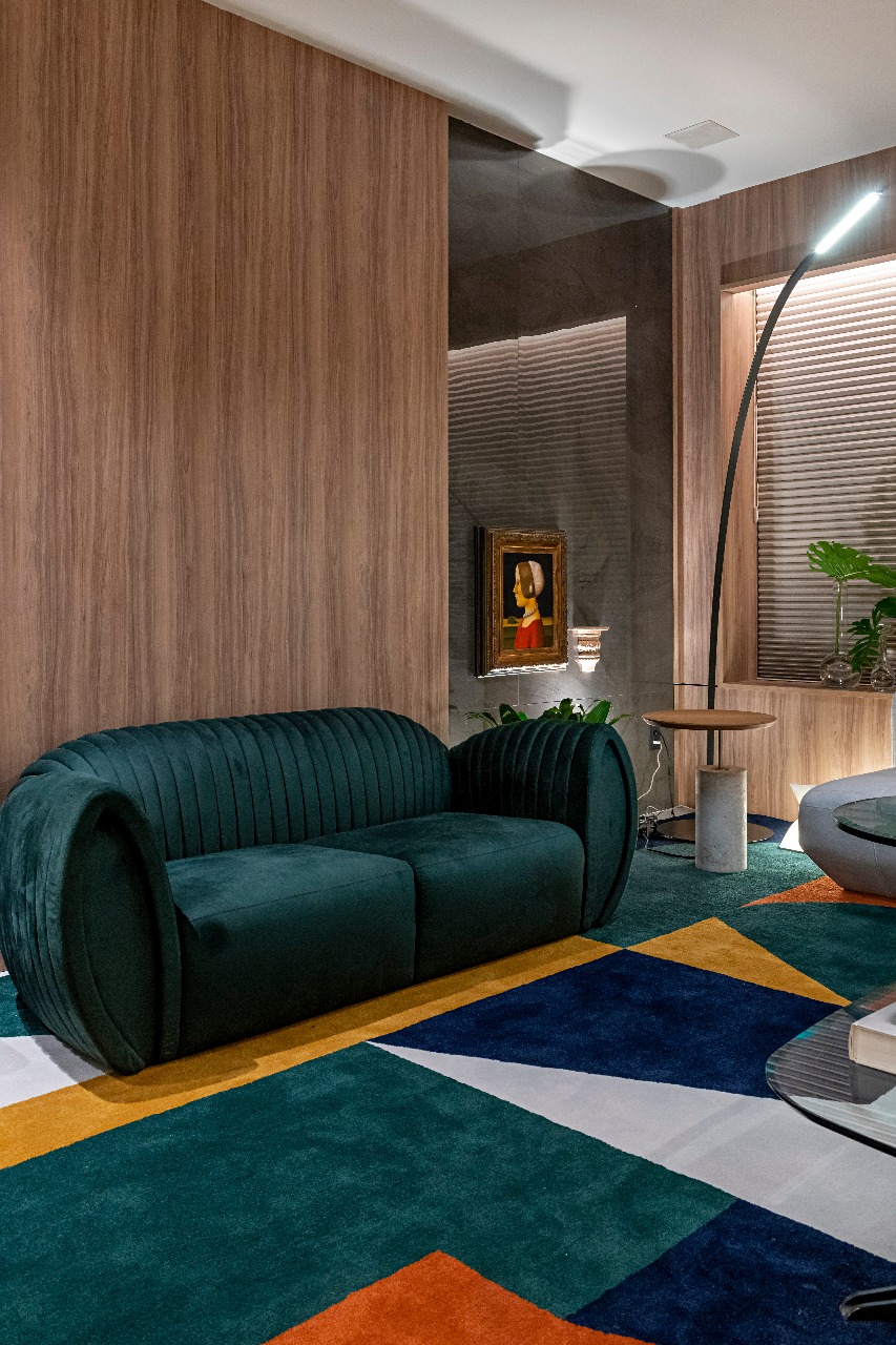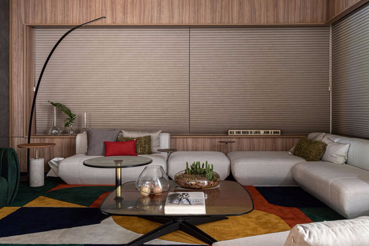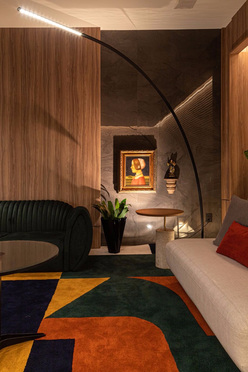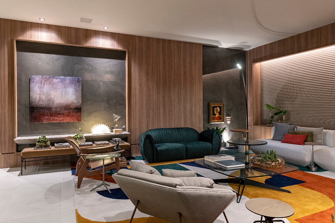 Através do tema Planeta Casa, o arquiteto Rogério Menezes do escritório Estudio RM explorou em 54m² um ambiente mais contemporâneo e atemporal, o Living Tríadee. O espaço tem como base os tons cinza e preto que recebem nuances colorida através do tapete inspirado no jardim de Burle Marx.