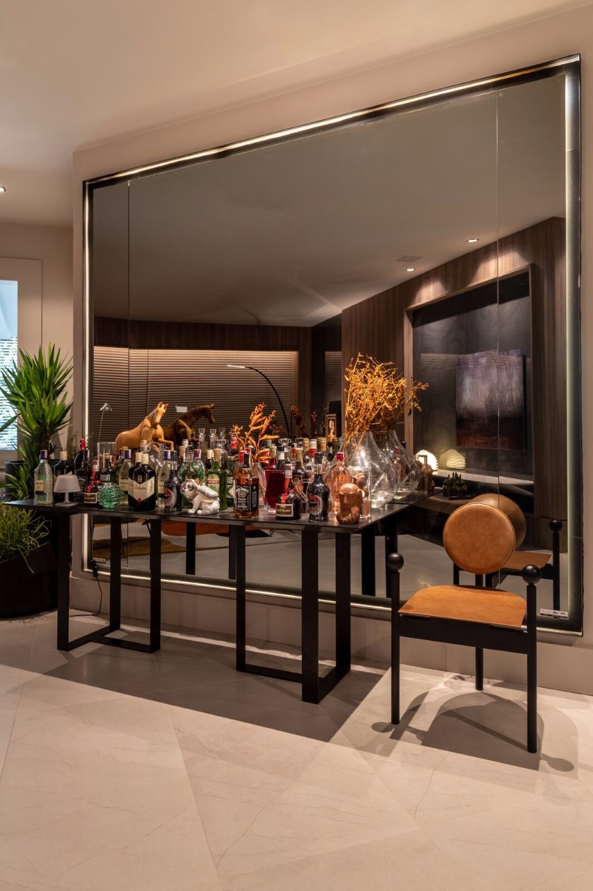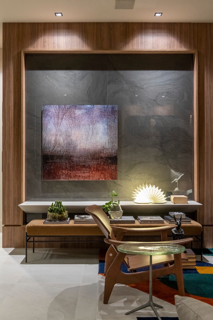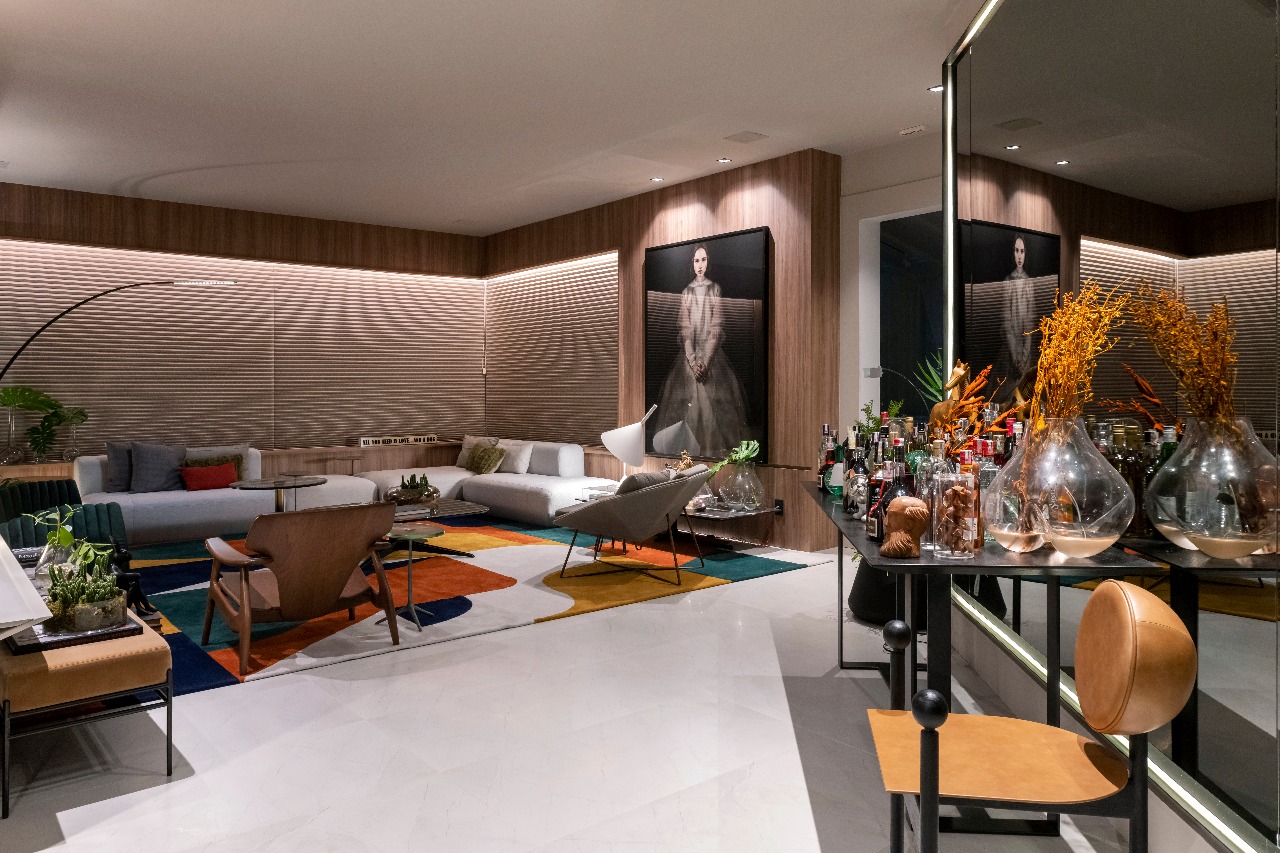 Conforto e integração estão presentes no living, além de peças decorativas que valorizam o design brasileiro. Para complementar a decor há obras de arte da Galeria Pena Cal e Zeca Fernandes Escritório de Arte.