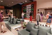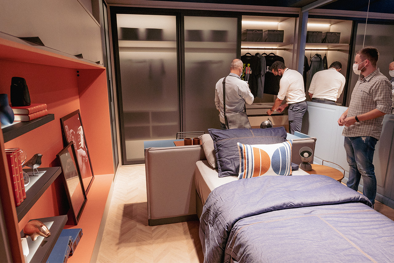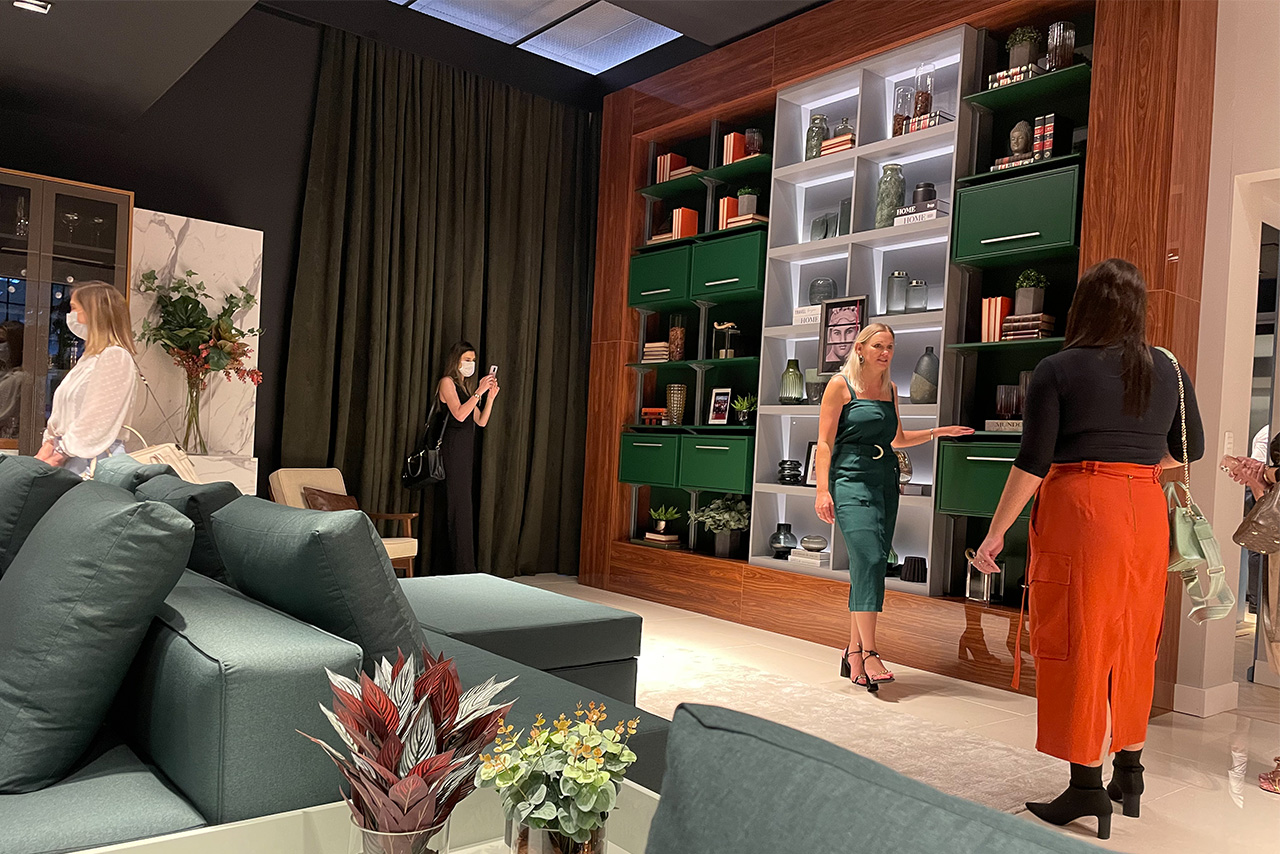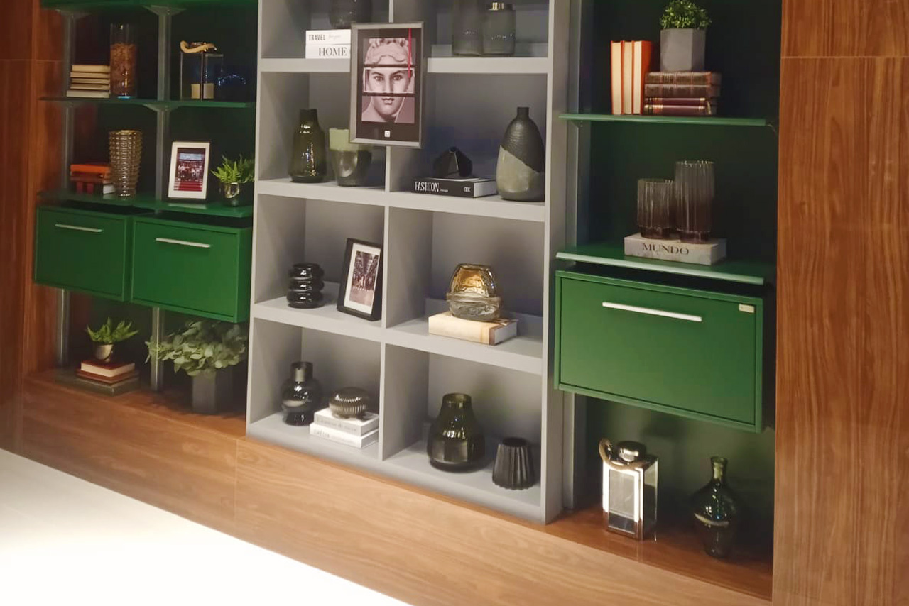 Na ocasião, os visitantes puderam contemplar os ambientes projetados tendo como ponto de partida os conceitos das coleções Pazzi, Louvre e Vinci da Renaissance Idélli 2021. O destaque fica para a estante da sala. O imponente móvel conta com a textura natural do pau ferro que reveste as laterais, base e topo, o verde intenso da lacca Pietá presente nas prateleiras e portas basculantes e o profundo Cinza Sagrado dos nichos. Além disso, a estrutura metálica que afixa as prateleiras dá o charme a esta estante que mescla elementos de todas as coleções da Renaissance.