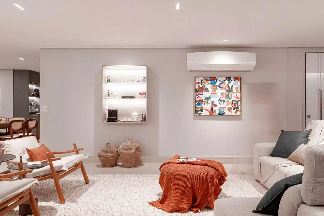 A versatilidade é uma das principais vantagens do acabamento em lacca. Sua aplicação em móveis planejados permite que ela assuma o protagonismo em grandes superfícies, atuando como ponto de destaque em detalhes estratégicos.