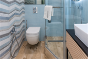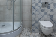 Padrões geométricos são ótimas opções para criar destaque e descontração ao ambiente. Se o banheiro for pequeno, opte por restringir a paleta de cores para que as formas se destaquem.