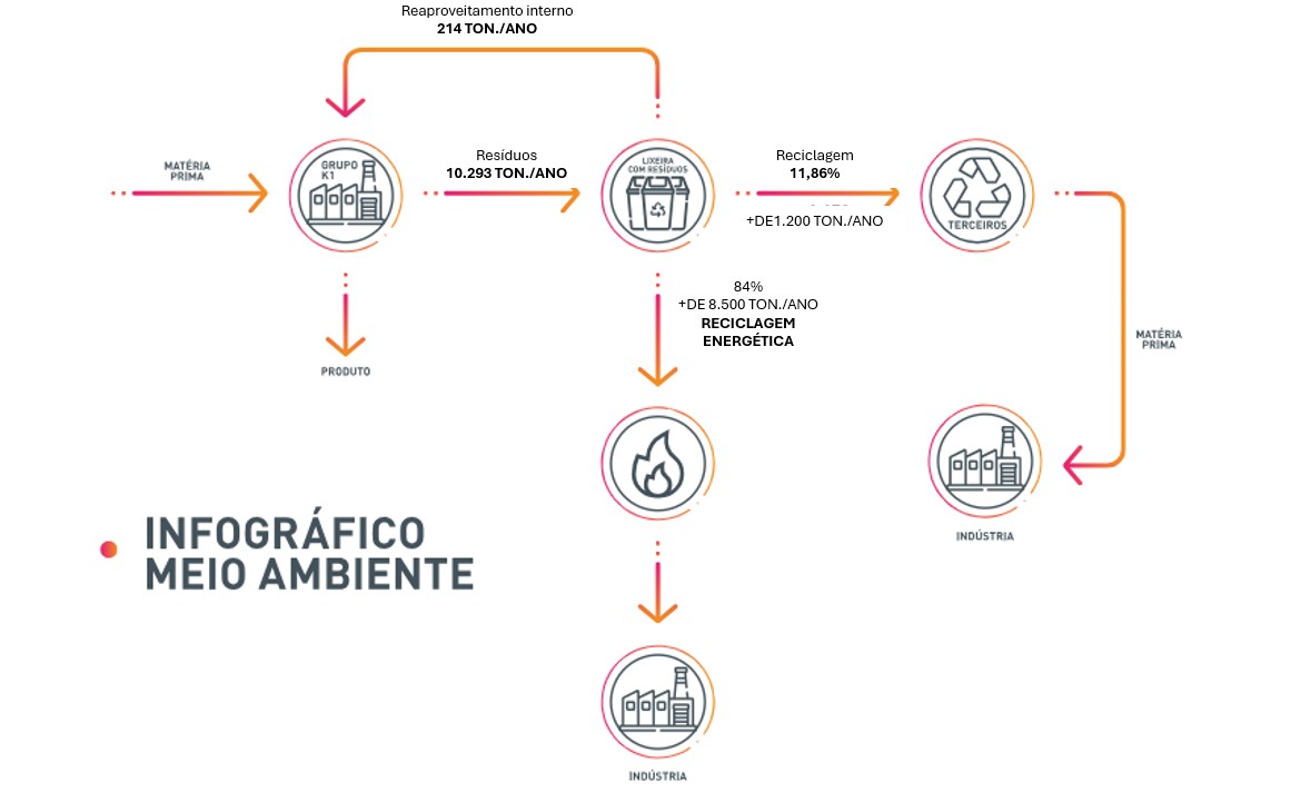 O Grupo K1 trabalha e desenvolve ações que contribuem para minimizar os resíduos industriais e fazer a correta destinação daqueles que ainda são gerados, sempre com responsabilidade com o meio ambiente e as pessoas. Prova disso é que, em 2024, foram geradas cerca de 10.293 toneladas de resíduos. Destes, 11,86% foram destinados para a reciclagem de material e 84% para a reciclagem energética.